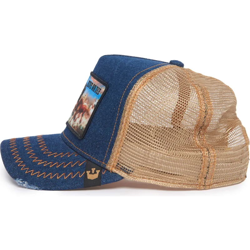 Niebiesko-beżowa czapka typu trucker Ride Or Die z koniem marki Goorin Bros. to niewątpliwie must-have dla miłośników mody streetwear. Uniseksowy krój sprawia, że jest to uniwersalny model, który mogą nosić zarówno mężczyźni, jak i kobiety, a zapięcie na zatrzask gwarantuje idealne dopasowanie do każdego typu głowy. Haftowany koń z przodu dodaje tej czapce szyku i oryginalności, dzięki czemu wyróżnia się na tle innych.