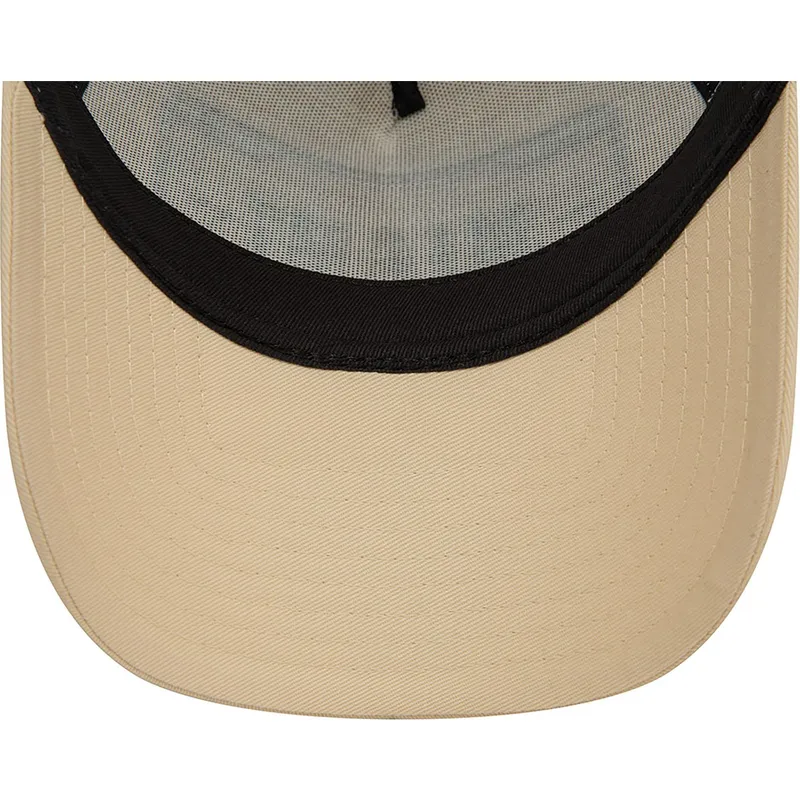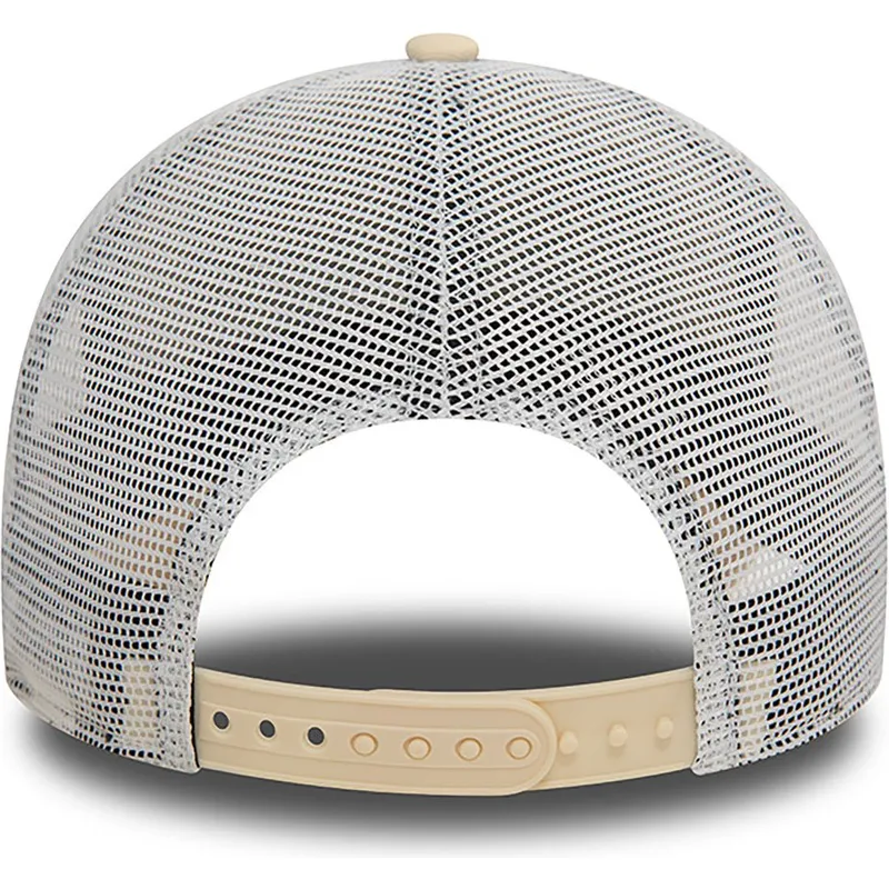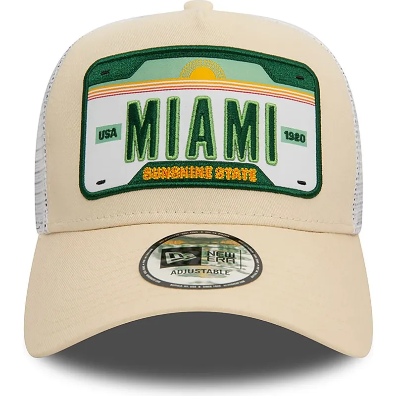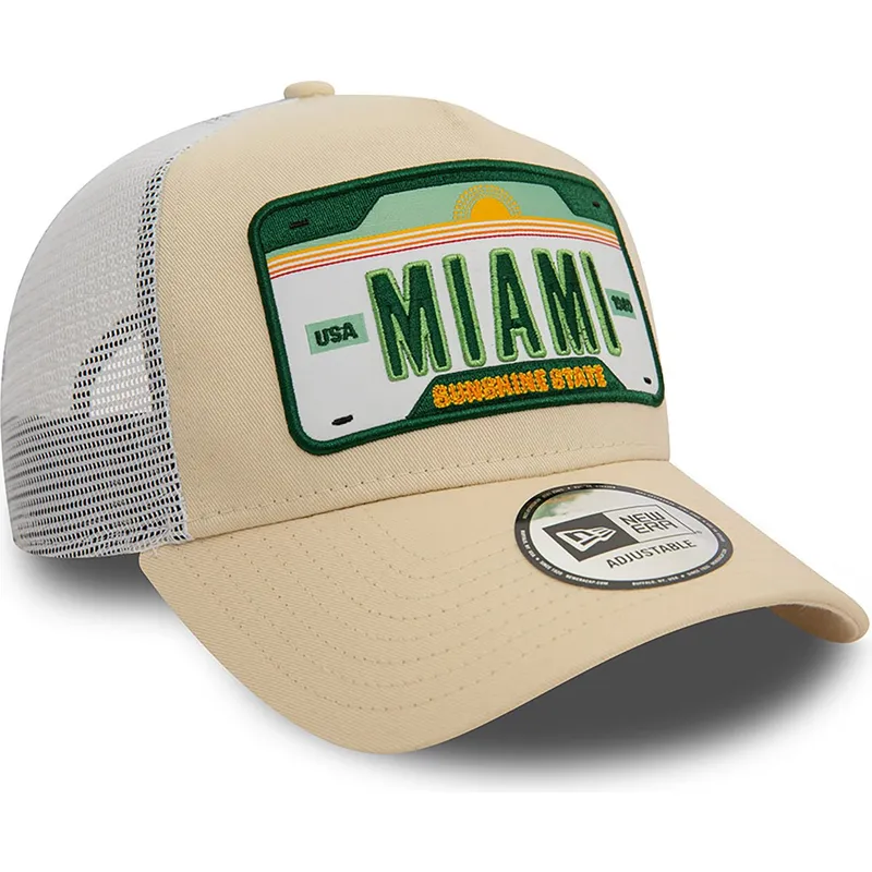 Beżowo-biała czapka typu trucker A Frame License Plate Miami Cities and Beaches marki New Era to must-have każdego miłośnika mody miejskiej i plażowej. Dzięki zapięciu typu snapback czapka ta gwarantuje idealne i wygodne dopasowanie przez cały czas, niezależnie od tego, jaką aktywność wykonujesz.