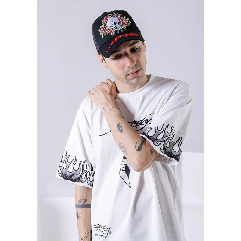 Czarna czapka typu trucker Ed Hardy Skull Rose to obowiązkowy dodatek dla każdego miłośnika mody miejskiej. Dzięki uniseksowemu designowi oraz nadrukowi czaszki i róży ta czapka jest idealna dla tych, którzy chcą się wyróżniać i wyznaczać trendy. Zapięcie na zatrzask zapewnia wygodne i bezpieczne dopasowanie, a logo marki z przodu dodaje mu autentyczności i jakości. Nie czekaj dłużej i dodaj tę niesamowitą czapkę do swojej kolekcji akcesoriów.