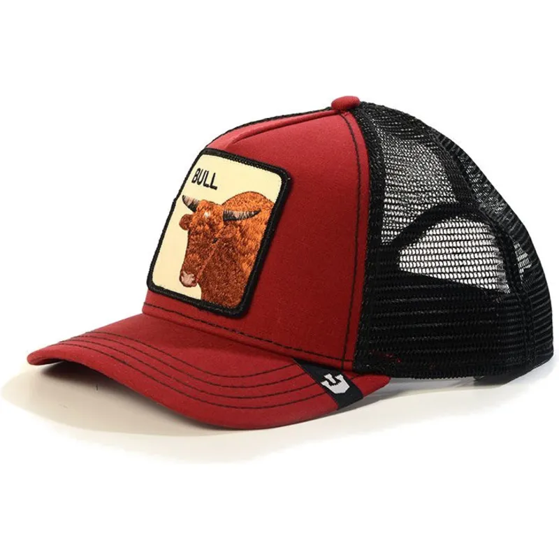Czerwona czapka truckerka z bykiem Bull od Goorin Bros.