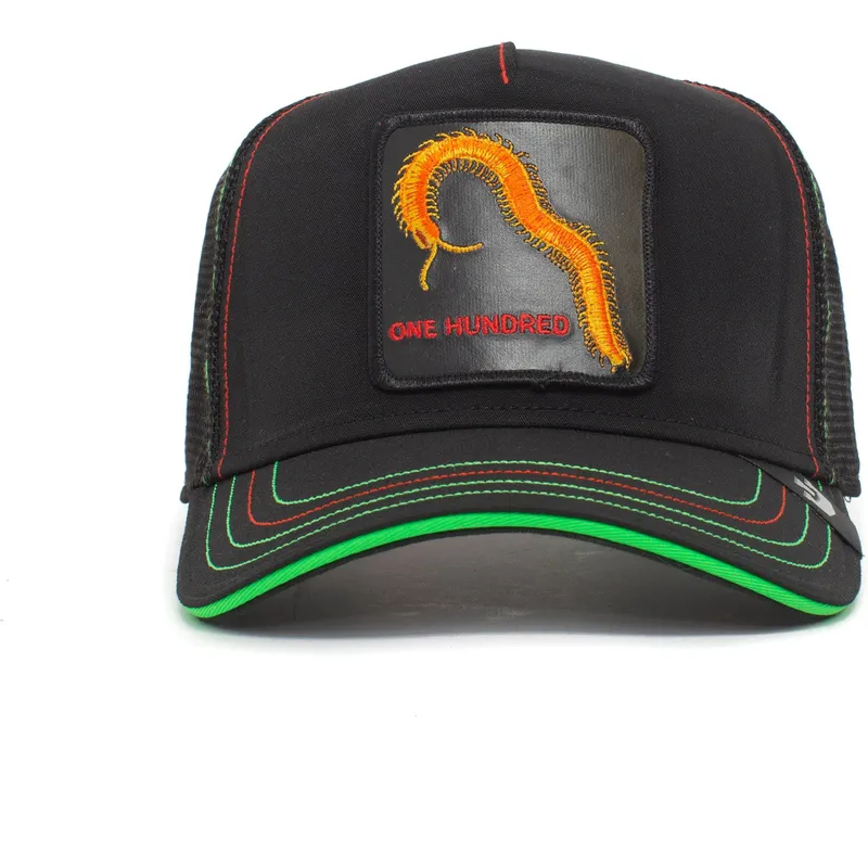 Goorin Bros. One Hundred Bug Blaster The Farm Centipede Zielono-czarna czapka Trucker to idealny wybór dla tych, którzy chcą wyróżnić się z tłumu. Z naszywką stonoga wyhaftowaną z przodu czapki, nie pozostaniesz niezauważona. Projekt naszywki sam w sobie jest dziełem sztuki, a jakość haftu jest imponująca.