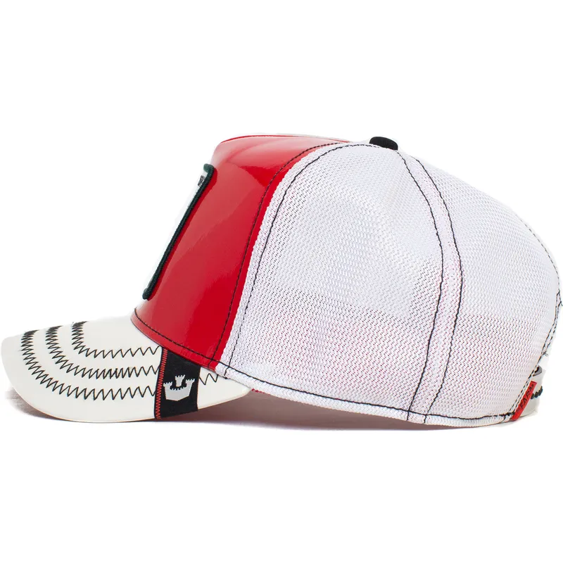 Czerwona i biała czapka trucker z krową Cash Golden Calf z lakierowanej skóry The Farm od Goorin Bros.